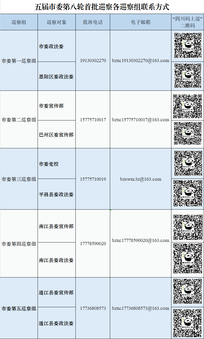 巡察期间,市委各巡察组设置了值班电话、电子邮箱和“四川码上巡”二维码。巡察组主要受理反映被巡察党组织领导班子及其成员和下一级党组织领导班子主要负责人,以及重点岗位人员问题的来信、来电、来访,重点是关于违反政治纪律、组织纪律、廉洁纪律、群众纪律、工作纪律和生活纪律以及巡视巡察整改等方面的问题反映。对其他不属于巡察受理范围的信访问题,将按规定移交有关单位认真处理。